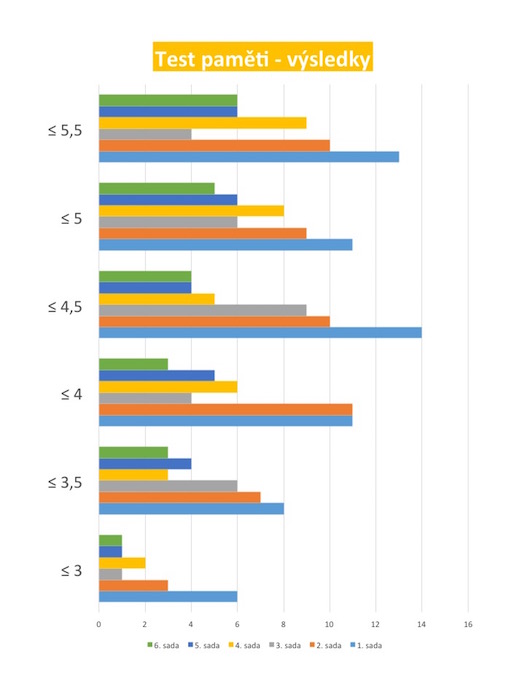 Žáci 5. ročníku připravili v MS PowerPoint obrázkový test krátkodobé paměti (každá skupinka byla odpovědná za 1 snímek). Test provedli na tabletech s dětmi z naší mateřské školy. Výsledky z jednotlivých tabulek byly vyneseny do společného grafu. Analýzou grafu žáci dospěli k zásadám pro efektivní pamětné učení - (sebe)motivace, přestávky pro obnovení pozornosti, učení v logických souvislostech. |