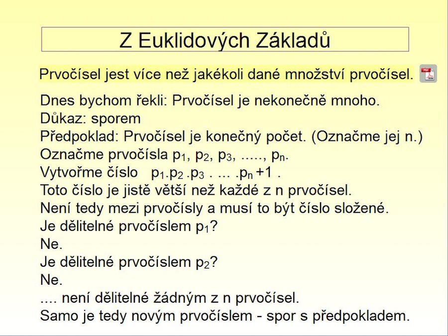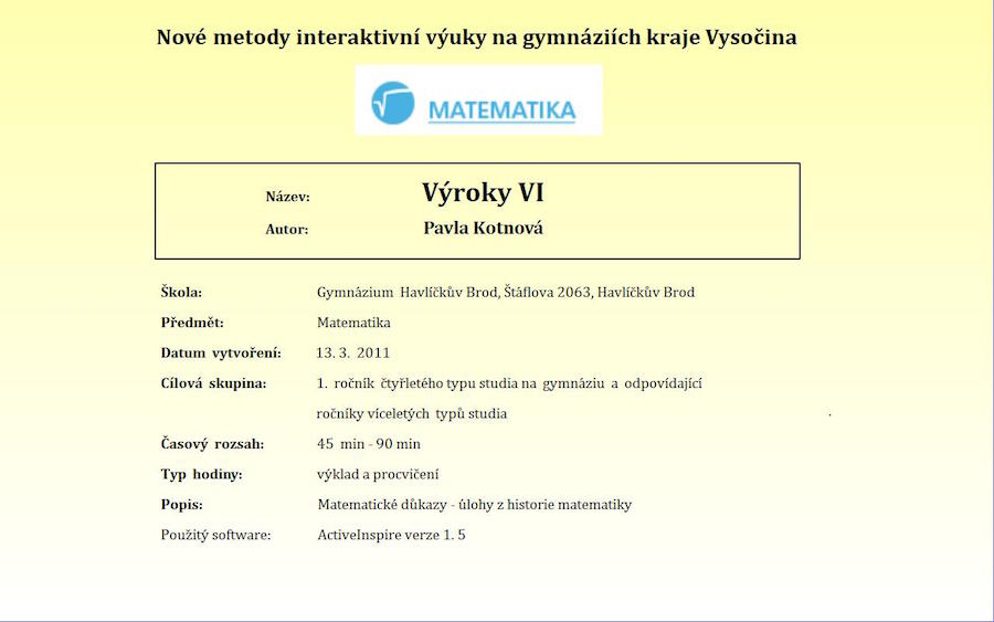 Výukový materiál byl vytvořen v rámci projektu Nové metody interaktivní výuky na gymnáziích kraje Vysočina. Je vytvořen v programu ActivInspire a určen k předvádění na interaktivní tabuli. Zpracované téma matematických důkazů z historie matematiky spadá do oblasti matematické logiky. Metodické poznámky a pracovní list jsou součástí sešitu. Pro zobrazení metodických poznámek je třeba otevřít v programu prohlížeče a zvolit poznámky. Pracovní list je ve formátu pdf a je skrytý pod ikonou přímo v prezentaci. |