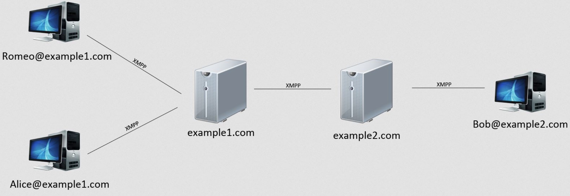 XMPP pracuje na principu klient-server, a síť je decentralizovaná, podobně jako u e-mailu. Uživatel si může zřídit účet u již běžícího serveru, nebo si zřídit vlastní server. Uživatel je identifikován uživatelským jménem anázvem serveru, oddělovačem je znak @, obdobně jako u e-mailu.